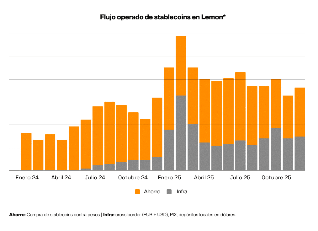 En Lemon, el volumen total operado de stablecoins creció 45% frente al año anterior. Si bien una parte importante se mantiene vinculada al ahorro, el crecimiento se explicó principalmente por su uso para cobros desde plataformas del exterior, ingresar dólares desde bancos locales o pagar en otros países como Brasil (PIX).