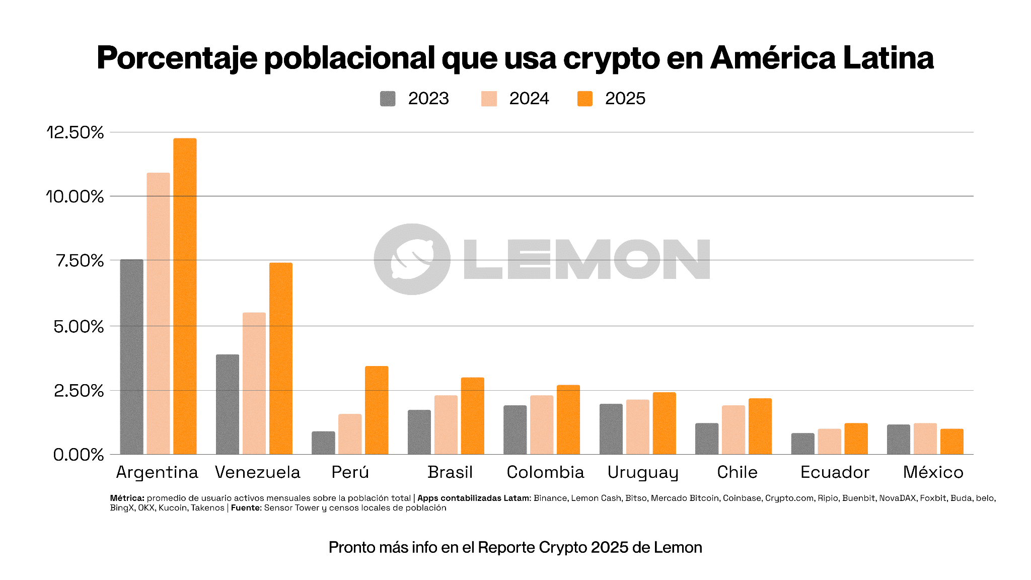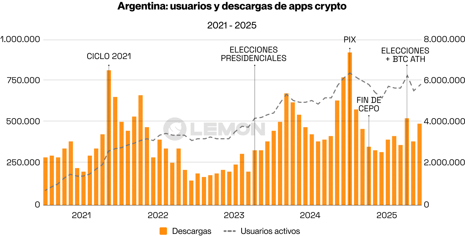 Lemon y Binance lideran el mercado argentino con el 70% de las sesiones activas, repartidos en partes iguales.