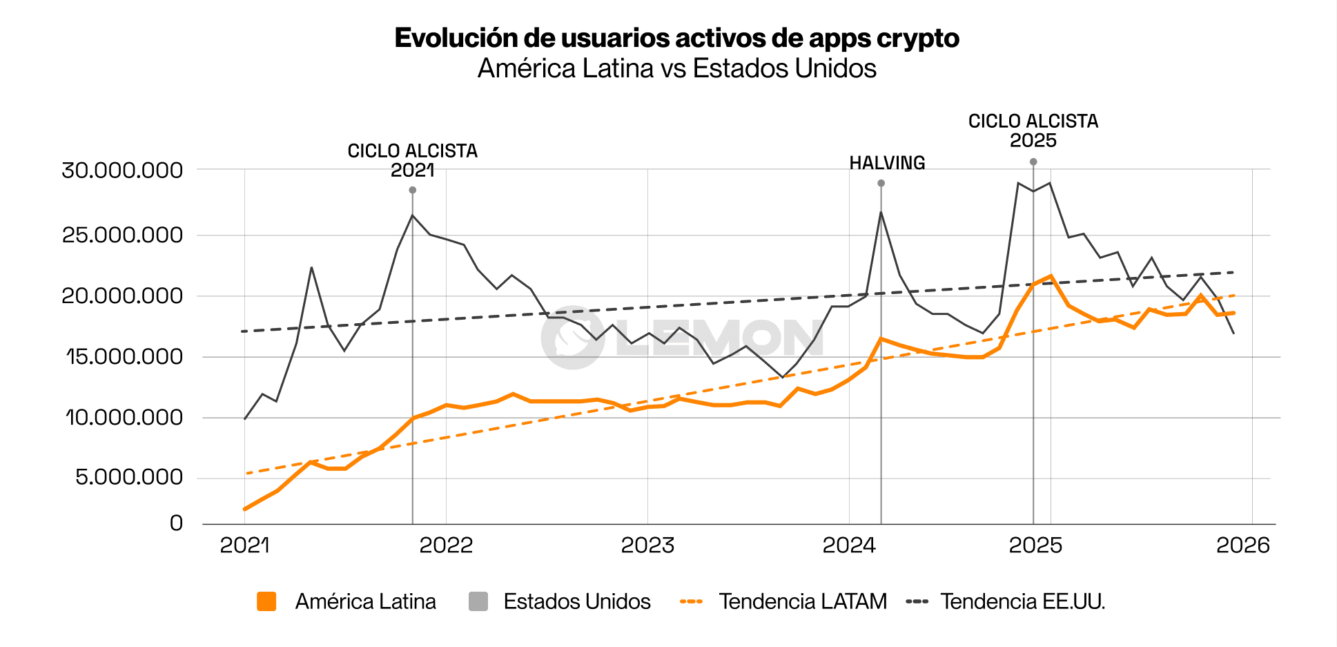 El reporte detalla cómo América Latina crece más rápido que Estados Unidos en usuarios activos, y mientras se habla menos de "crypto" en Argentina, hay 4 veces más personas usándolo que en el ciclo alcista del 2021, sin percibirlo.