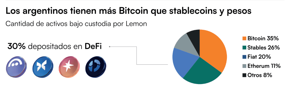 En Argentina, Bitcoin es el activo más holdeado (guardado) por los usuarios de Lemon, por encima del dólar cripto y del peso.
